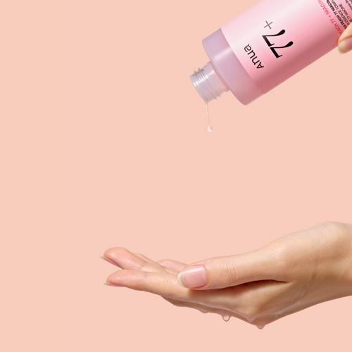 Dispense a moderate amount of Anua Peach 77 Niacin Essence Toner onto the palm of your hand. The amount you use can be adjusted based on your personal preference, but a few drops should suffice.